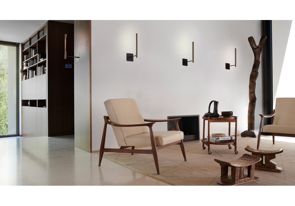 Ilo von David Lopez Quincoces für Oluce entworfen, ist eine Wandleuchte aus Metall mit mattschwarz lackierter Tragstruktur. Der verstellbare Diffusor besteht aus bronzefarben lackiertem Aluminium mit LED-Lichtquelle.