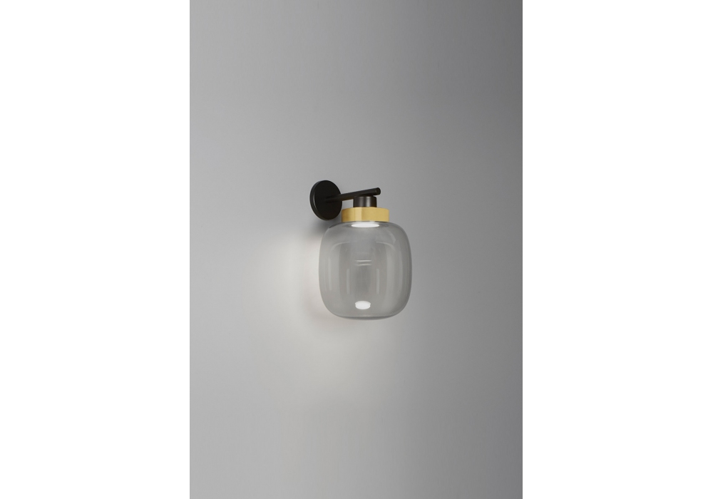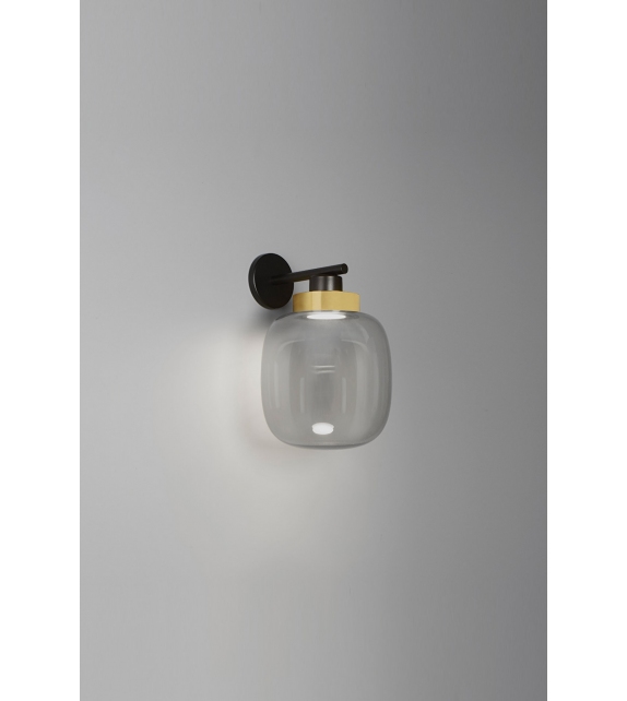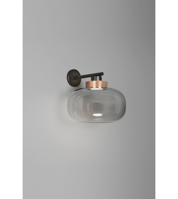 557 Legier von Corrado Dotti für Tooy entworfen, ist eine LED-Wandleuchte mit sandschwarzer Struktur, Lampenanschluss aus Kupfer, gebürstetem Messing oder lackiert, während der Diffusor aus geblasenem Glasopal, weiß oder geräuchert besteht. LED enthalten.