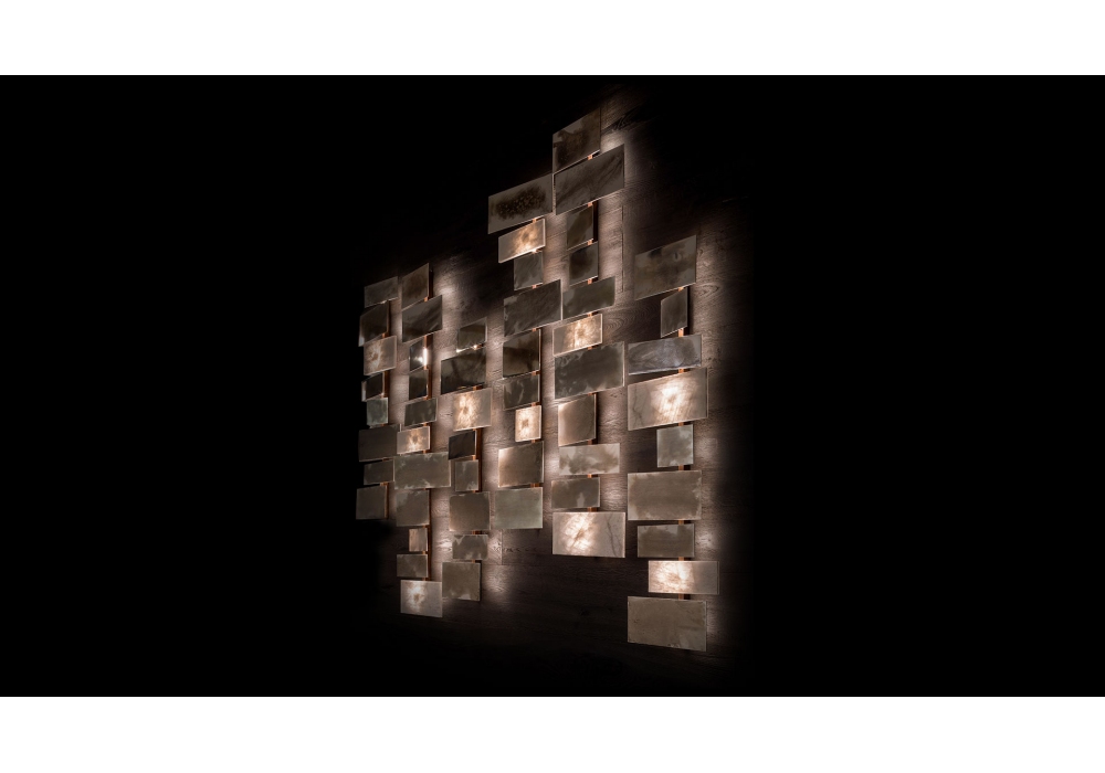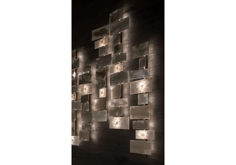 Abaco von Massimo Castagna für Henge entworfen, ist eine LED-Wandleuchte mit Metallstruktur und Lampenschirm in passenden weißen Chrystal-Stein- und Metalloberflächen. Verfügbar in mehreren Ausführungen und Abmessungen.
