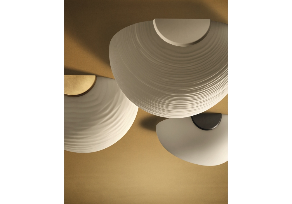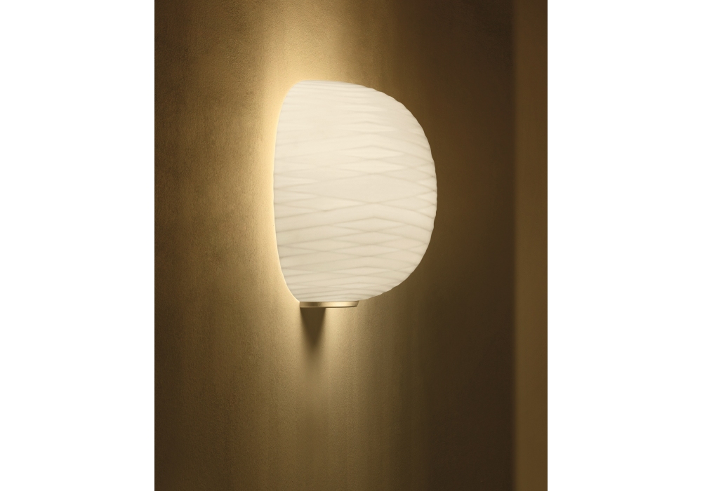 Gem von Ludovica & Roberto Palomba für Foscarini entworfen, ist eine Wandleuchte mit tragender Struktur aus lackiertem Metall und halbkugelförmigem Diffusor aus geätztem, weißem, geblasenem Glas mit Reliefoberfläche. Die angenommene Lichtquelle ist mit LED- oder Halogen-E27-Fassung. Gem ist in verschiedenen Strukturausführungen erhältlich.