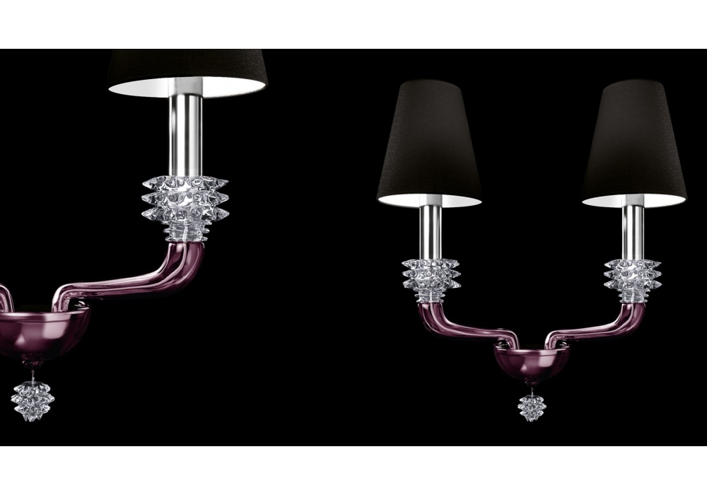 Rotterdam, entworfen und hergestellt von Barovier & Toso, ist eine Wandleuchte mit Metalltragstruktur und sichtbaren Teilen in poliertem Chrom oder verzinktem Gold. Der Lampenkörper ist vollständig mit venezianischem Glas bedeckt, das in verschiedenen Farben erhältlich ist. Die Lichtquellen sind dimmbare Glühlampen (nicht im Lieferumfang enthalten), abgeschirmt von zwei Stofflampenschirmen, die in den folgenden Farben erhältlich sind: schwarz, weiß oder schwarz mit goldener Innenseite.