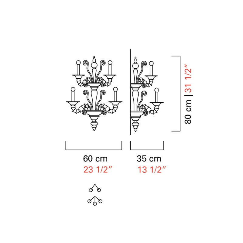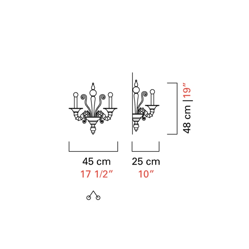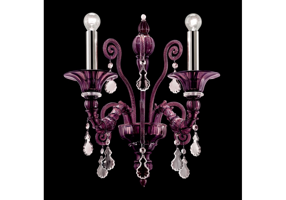Taif entworfen und hergestellt von Barovier & Toso ist eine Wandleuchte mit tragender Struktur und Details aus verzinktem Gold oder poliertem Chrommetall. Die Arme und der Lampenkörper sind mit venezianischem Glas mit Kristallanhängern bedeckt. Als Leuchtmittel kommen LED oder dimmbares Halogen zum Einsatz. Taif ist in verschiedenen Modellen und Ausführungen erhältlich.