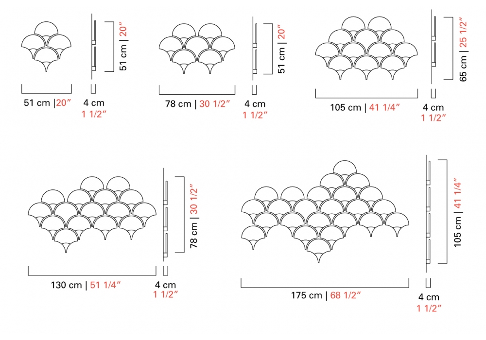 | Abmessungen | 51 x 4 x H 51 cm; 78 x 4 x H 51 cm; 105 x 4 x H 65 cm; 130 x 4 x H 78 cm; 175 x 4 x H 105 cm. |
