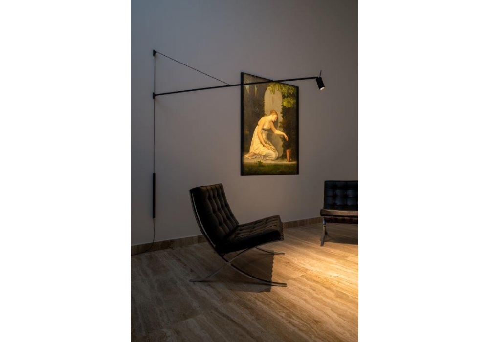 Swan von Bernhard Osann für Nemo entworfen, ist eine Wandleuchte mit tragender Struktur aus mattschwarz lackiertem Aluminium. Der Arm hat eine horizontale Beweglichkeit von 180 ° und eine vertikale von 40 ° stabilisiert durch ein Gegengewicht mit Lederbezug. Der Spot hat eine zylindrische Form und beherbergt eine dimmbare LED-Lichtquelle mit einem Wabendiffusor, der dem Lichtstrahl Flexibilität verleiht.