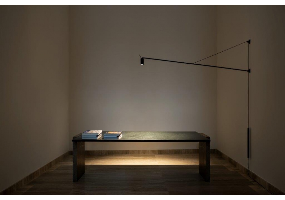 Swan von Bernhard Osann für Nemo entworfen, ist eine Wandleuchte, mit tragender Struktur aus mattschwarz lackiertem Aluminium. Der Arm hat eine horizontale Beweglichkeit von 180 ° und eine vertikale von 40 °, stabilisiert durch ein Gegengewicht mit Lederbezug. Der Spot hat eine zylindrische Form und beherbergt eine dimmbare LED-Lichtquelle mit einem Wabendiffusor, der dem Lichtstrahl Flexibilität verleiht.