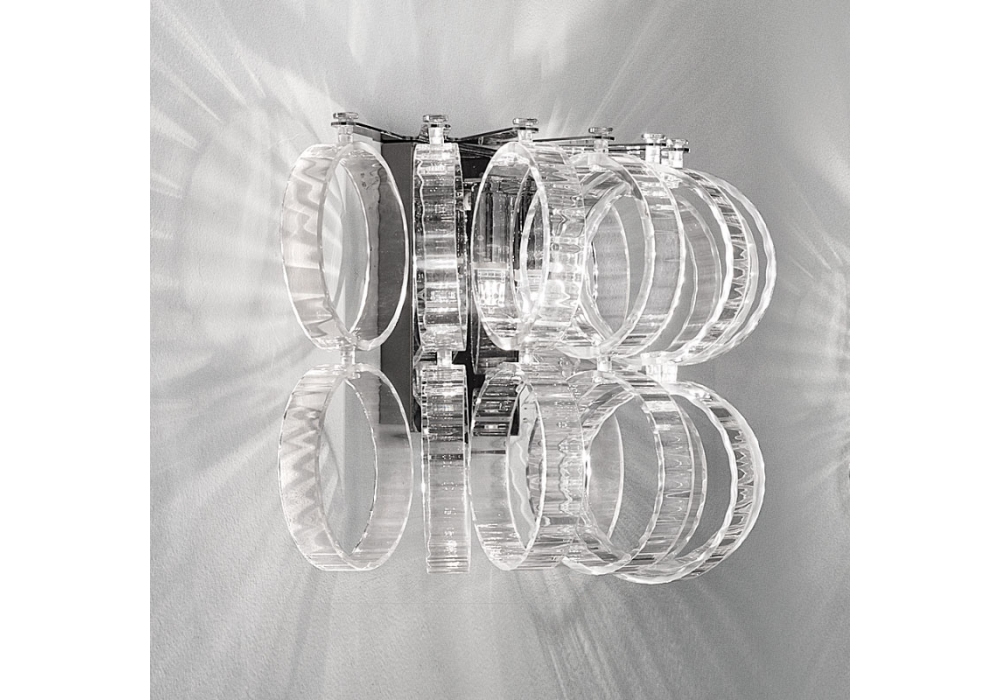 Ecos von Renato Toso Noti Massari & Associati für Vistosi entworfen ist eine Wandleuchte mit tragender Struktur aus lackiertem Metall. Der Diffusor ist durch eine Reihe von kreisförmigen Kristallelementen strukturiert, die nebeneinander angeordnet sind und eine dimmbare LED- oder Halogen-Lichtquelle mit G9-Anschluss abschirmen. Ecos ist in verschiedenen Ausführungen erhältlich.