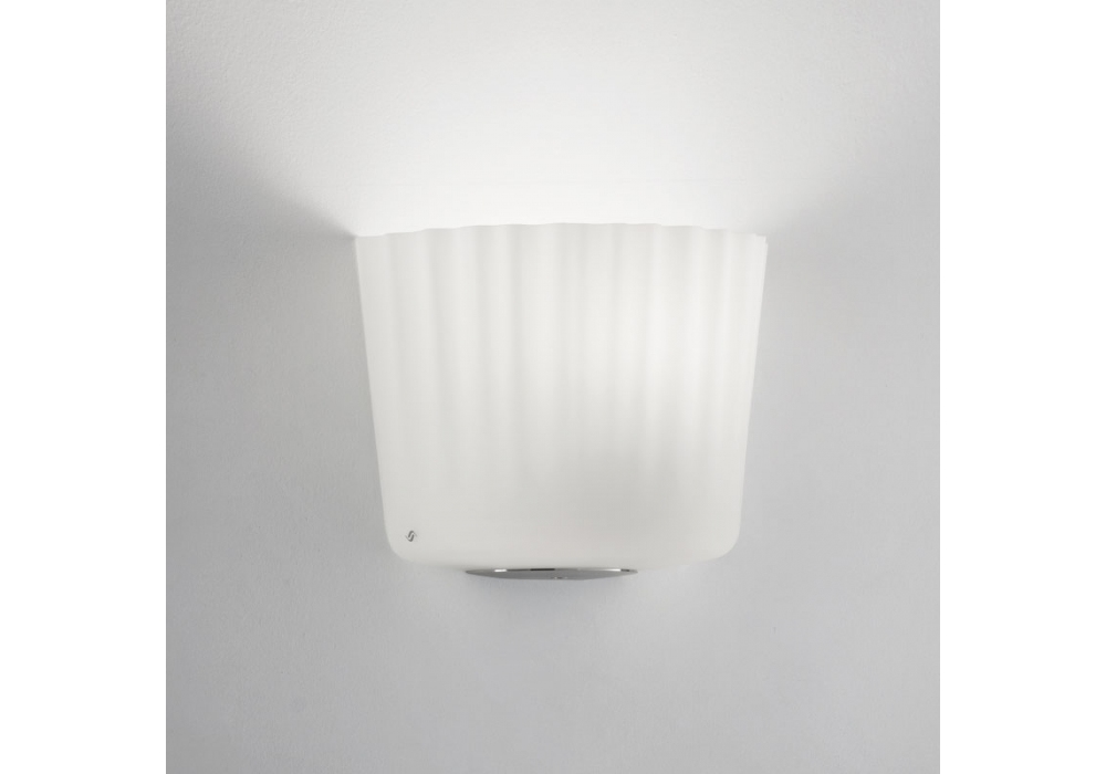 Cloth von Romani Saccani Architetti Associati für Vistosi entworfen ist eine Wandleuchte mit tragender Struktur aus glänzend chromfarbenem Metall. Der Diffusor besteht aus halbkreisförmigem Glas mit gewellter Oberfläche und schirmt eine dimmbare LED- oder Halogenlichtquelle mit E27-Fassung ab. Tuch ist in verschiedenen Diffusorausführungen erhältlich.