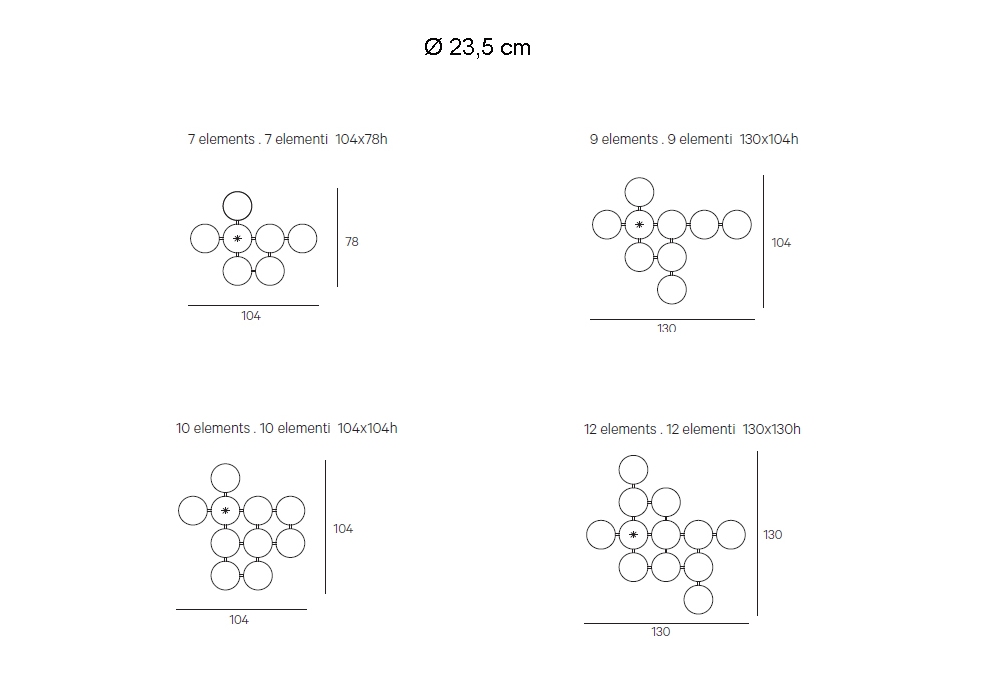 | Abmessungen | 104 x 78 cm (Ø 23,5 cm); 130 x 104 cm (Ø 23,5 cm); 104 x 104 cm (Ø 23,5 cm); 130 x 130 cm (Ø 23,5 cm); 173 x 129 cm (Ø 40 cm); 216 x 173 cm (Ø 40 cm); 173 x 173 cm (Ø 40 cm); 216 x 216 cm (Ø 40 cm). |