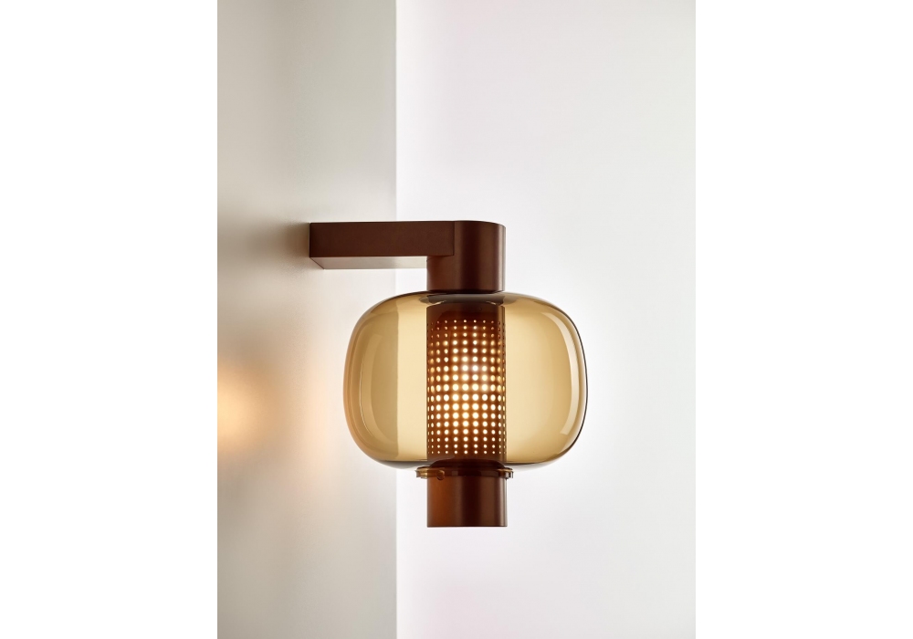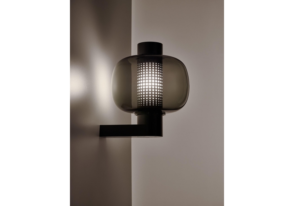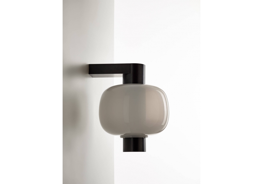 Bonbori von Fumie Shibata für Brokis entworfen, ist eine Wandleuchte mit tragender Struktur aus pulverbeschichtetem Metall. Der Diffusor ist zylindrisch aus mundgeblasenem Glas und schirmt eine dimmbare LED-Lichtquelle ab. Bonbori ist in verschiedenen Modellen und Ausführungen erhältlich.