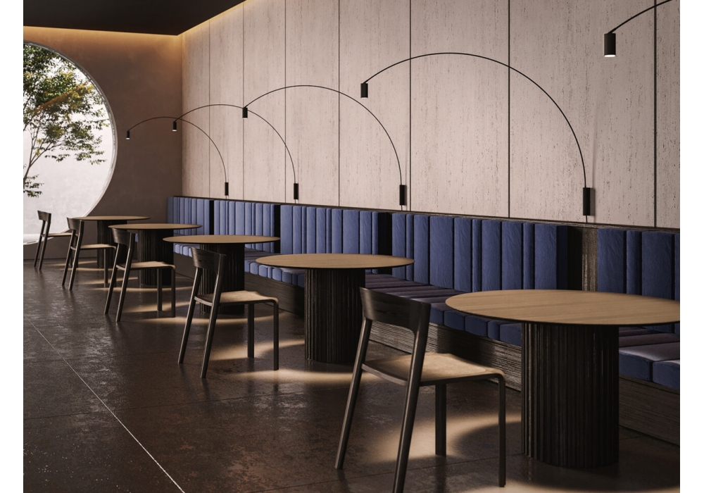 Fox von Bernhard Osann für Nemo entworfen, ist eine verstellbare Wandleuchte mit Struktur aus mattschwarz lackiertem Stahlrohr. Der Diffusor hat eine zylindrische Form, die um eine vertikale Achse von 90 ° bewegt werden kann, und nimmt eine dimmbare LED-Lichtquelle auf.