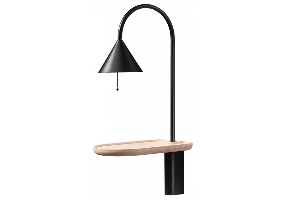 Ozz Wall S von Paolo Cappello & Simone Sabatti für Miniforms entworfen, ist eine Wandleuchte aus schwarzem Metall, erhältlich mit Ablage in Esche natur oder ohne.