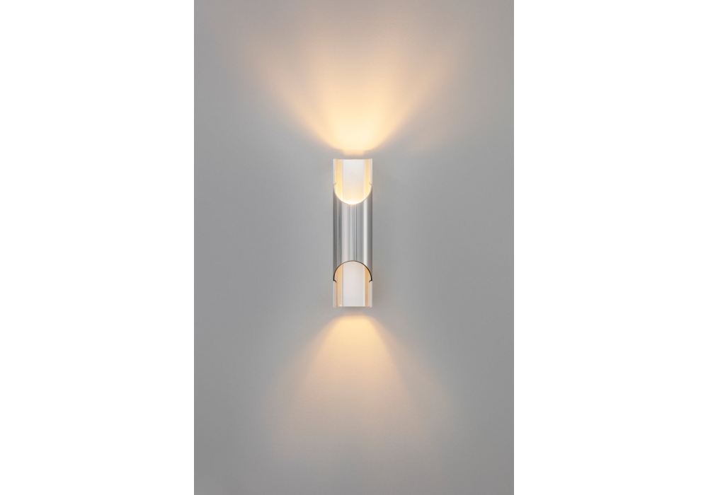 Pan von Bent Karlby für Lyfa entworfen, ist eine Wandleuchte aus poliertem Aluminium, deren Form von der Panflöte inspiriert ist. Erhältlich in verschiedenen Größen.