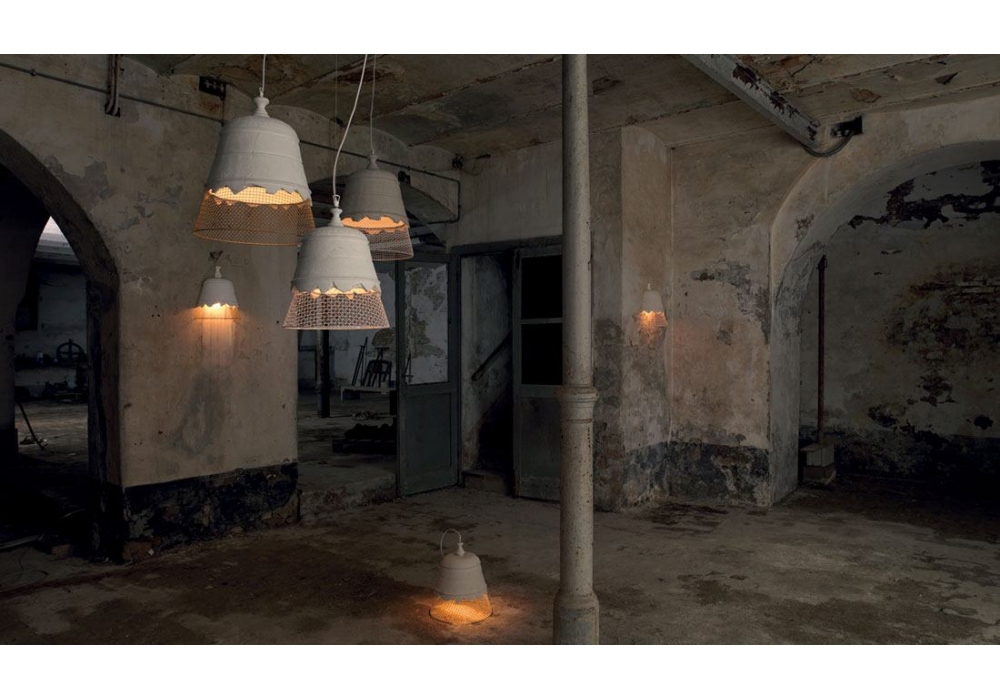 Domenica, von Luca De Bona und Dario De Meo für Karman entworfen, ist eine Wandleuchte aus weißem Gips und Metallgewebe, die in 2 Ausführungen erhältlich ist. Glühbirne nicht enthalten.