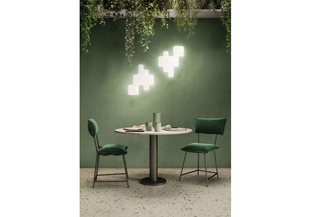 Pixel, von Bakery Group für Kundalini entworfen, ist eine Wandleuchte/Deckenleuchte it Diffusor aus rotationsgeformtem Polyethylen, der an der tragenden Struktur aus lackiertem Metall befestigt ist.