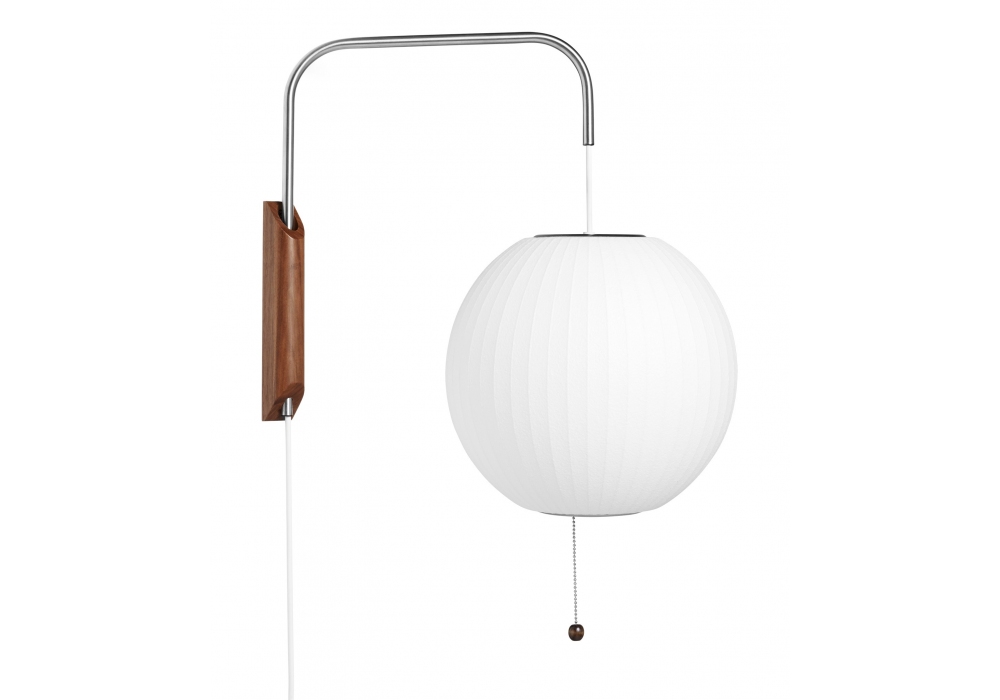 Nelson Ball von George Nelson für Hay entworfen, ist eine Wandleuchte mit Lampenschirm aus Polymergewebe, Gestell aus lackiertem und gebürstetem Metall und oberem und unterem Ring aus Nickel. Eine Wandhalterung aus Walnussholz und ein Stahlarm mit Drehscharnier. Isolierendes Kabel aus weißem PVC.