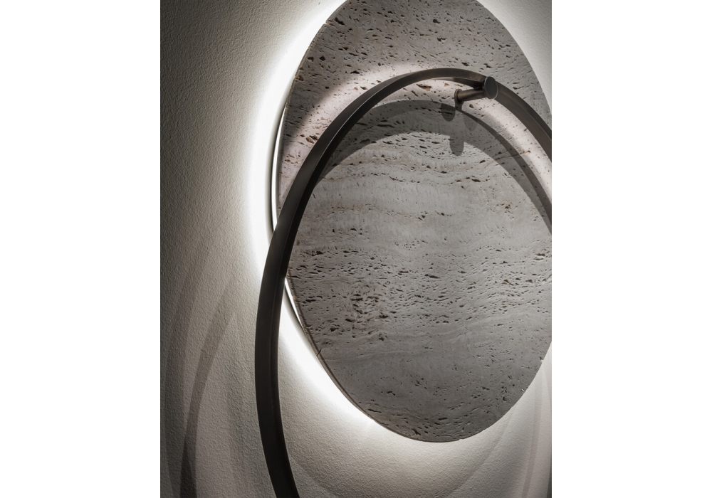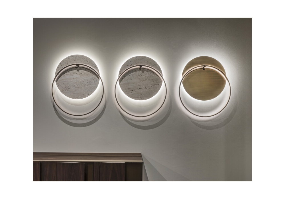 Myring von Adele Martelli für Emmemobili entworfen, ist eine Wandleuchte, die aus zwei Kreisen besteht. Der Ring besteht aus Messing, während die Scheibe aus Holz, Messing oder Marmor sein kann. Beleuchtung mit LED-Streifen. Dimmbare Version auf Anfrage und gegen Aufpreis erhältlich.