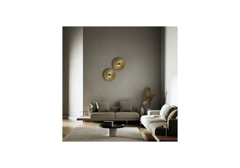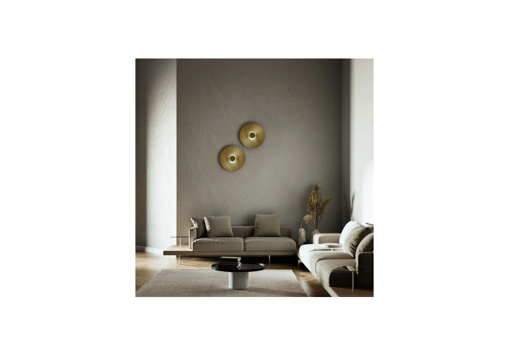 Pliè von Paolo Dell'Elce für Il Fanale entworfen ist eine runde Wandleuchte mit einer plissierten Oberfläche aus natürlichem Messing. Der Diffusor hat eine zylindrische Form und verfügt über eine LED-Lichtquelle mit integriertem Triac-Dimmsystem. Pliè ist in verschiedenen Modellen erhältlich.