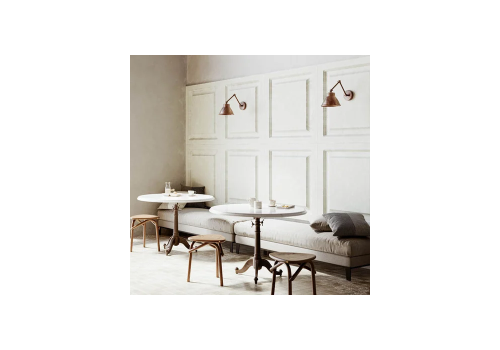 Loft von Dt Studio für Il Fanale entworfen ist eine Wandleuchte mit beweglicher Armstruktur aus Eisen und Messing. Der Lampenschirm ist kreisförmig geformt, ebenfalls aus Metall gefertigt und schirmt eine dimmbare LED-Lichtquelle ab.