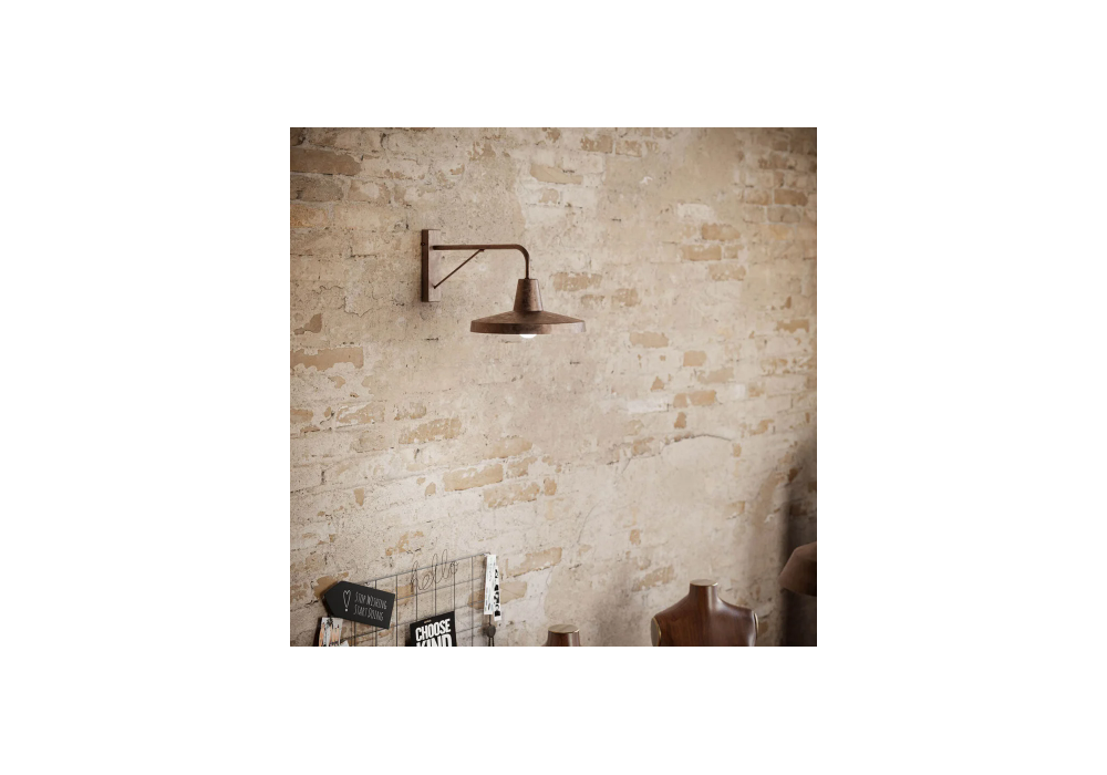 Officina von Dt Studio für Il Fanale entworfen ist eine Wandleuchte mit tragender Struktur aus Metallrohr, lackiert in einer antiken Eisenfarbe. Der Diffusor hat eine kreisförmige Form und schirmt eine LED-Lichtquelle mit einem Triac-Dimmsystem ab.