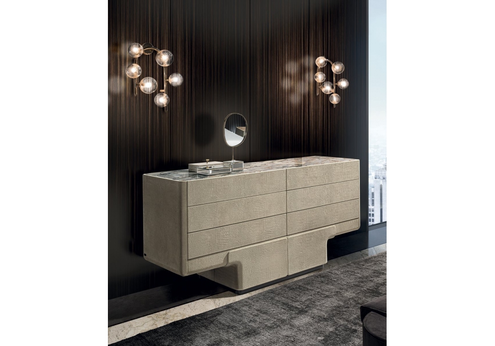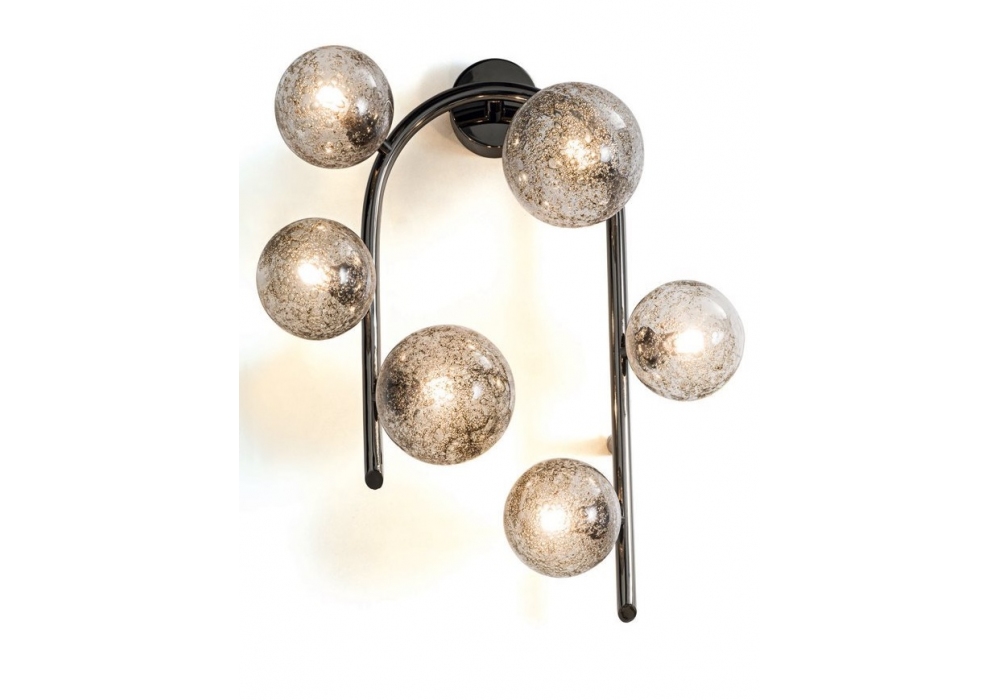 Rialto von Giuseppe Iasparra für Longhi entworfen, ist eine Wandleuchte mit Metallstruktur in hellgoldenen und schwarzen galvanischen Oberflächen. Geblasene Glaskugeln in verschiedenen Größen mit goldenen Einsätzen für die hellgoldene und Messingstruktur für die Version mit schwarzem Nickel-Finish. Verügbar in mehreren Abmessungen.