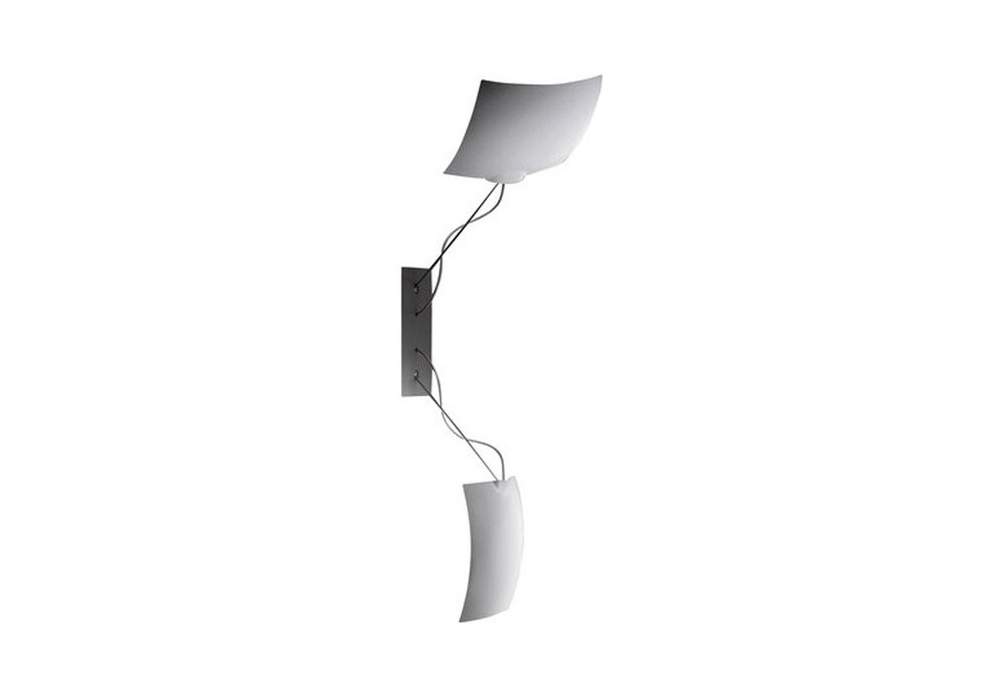 2 x 18 x 18, entworfen und hergestellt von Ingo Maurer, ist eine Wandleuchte mit doppeltem Lampenschirm aus pulverbeschichtetem Aluminium, Struktur aus Edelstahl und Kunststoff. Zwei Kugelgelenke ermöglichen eine besonders flexible Einstellung.