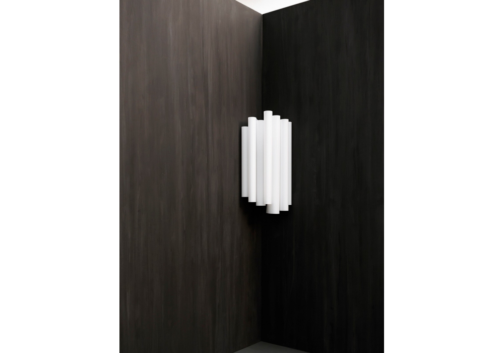 Vertical Nest, von Brian Thoreen für Tacchini entworfen, ist eine Eckwandleuchte aus weißem Polycarbonat mit dekorativen und modernen Linien.