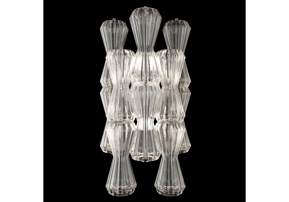 Clepsydra entworfen und hergestellt von Barovier & Toso ist eine Wandleuchte mit tragender Struktur und Details aus poliertem Chrom oder verzinktem goldfarbenem Metall. Der Diffusor besteht aus verschiedenen sanduhrförmigen Elementen aus venezianischem Glas und bildschirmdimmbaren LED oder Halogenlichtquellen. Clepsydra ist in verschiedenen Ausführungen erhältlich.