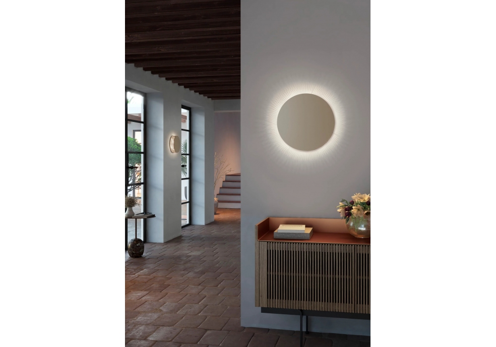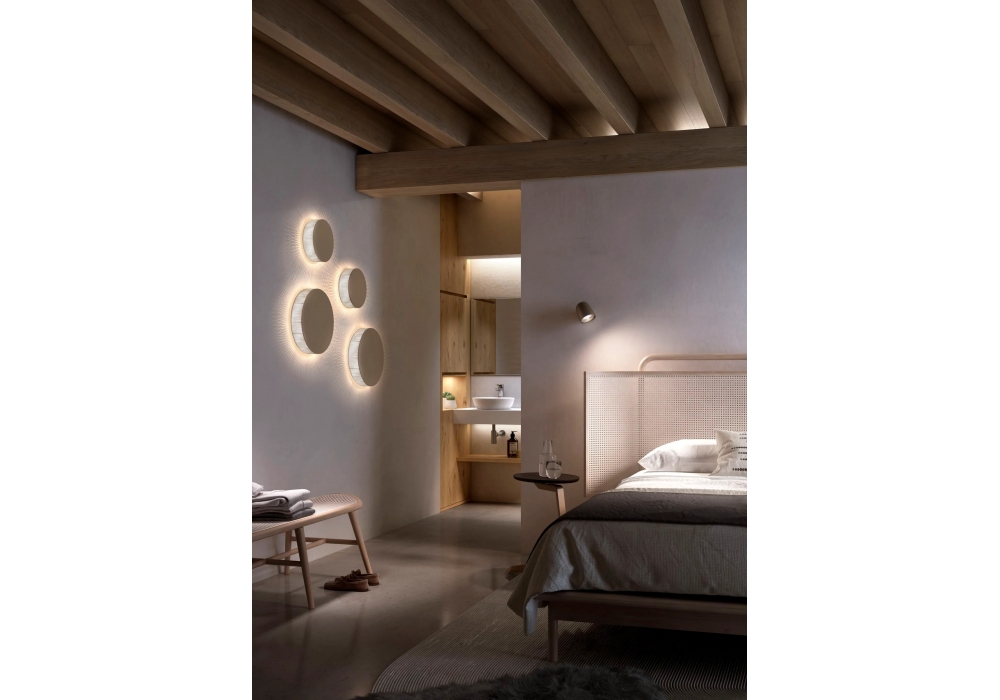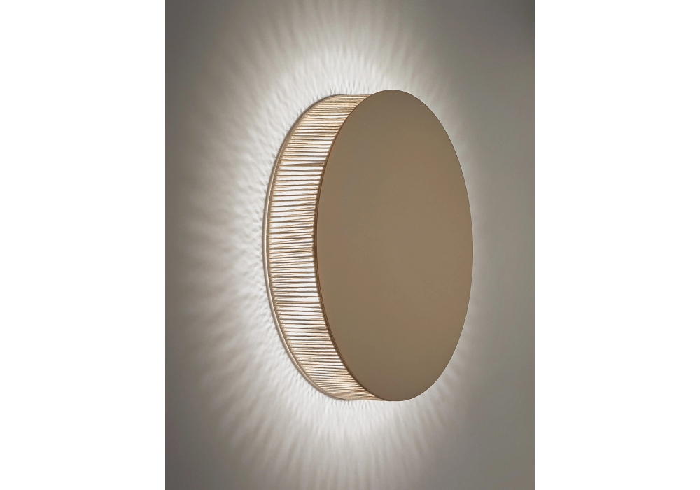 Helios von Gonzalo Milà für Bover entworfen ist eine runde Wandleuchte mit Stütze und Tragstruktur aus Metall und lackiertem Aluminium. Der Lampenschirm besteht aus Baumwollfäden und schützt eine LED-Lichtquelle mit einem Triac-Dimmersystem. Helios ist in verschiedenen Modellen erhältlich.