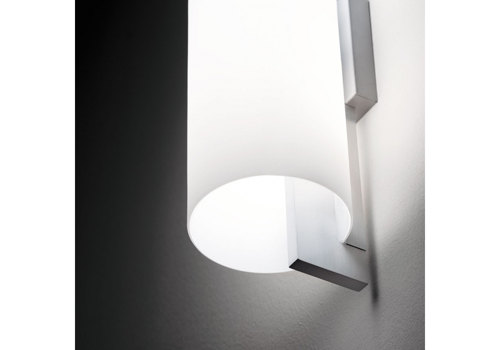 Phi von Filippo Taidelli für Firmamento Milano entworfen, ist eine Wandleuchte, die diffuses Licht spendet und aus einem Diffusor aus geblasenem Opalglas mit Säureätzung und einer Struktur aus satiniertem Nickelaluminium besteht.