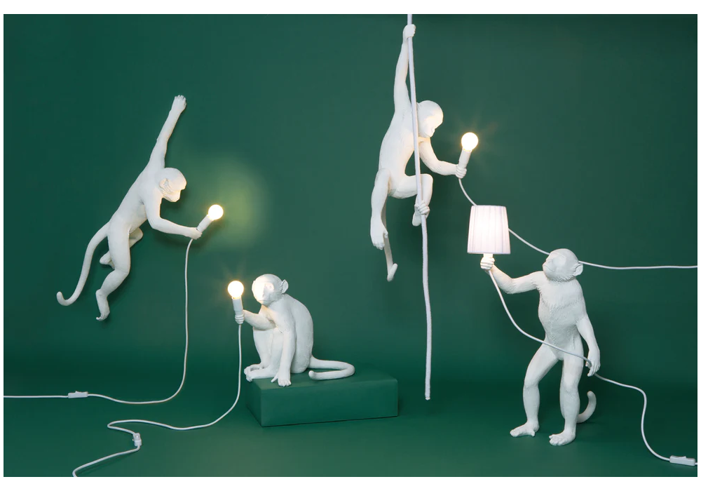 Die von Marcantonio Raimondi Malerba für Seletti entworfene Monkey Lamp ist eine Wandleuchte aus weißem Harz, die von einem Stoffseil getragen wird. Bei der verwendeten Lichtquelle handelt es sich um eine Glühfaden-LED.