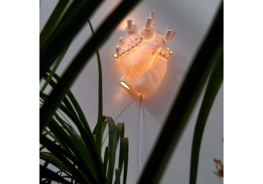 Heart von Marcantonio für Seletti entworfen ist eine Wandleuchte aus sehr feinem weißem Porzellan die die Anatomie eines menschlichen Herzens darstellt. Bei der verwendeten Lichtquelle handelt es sich um eine LED-Lichtquelle, die über ein Kunststoffkabel betrieben wird.