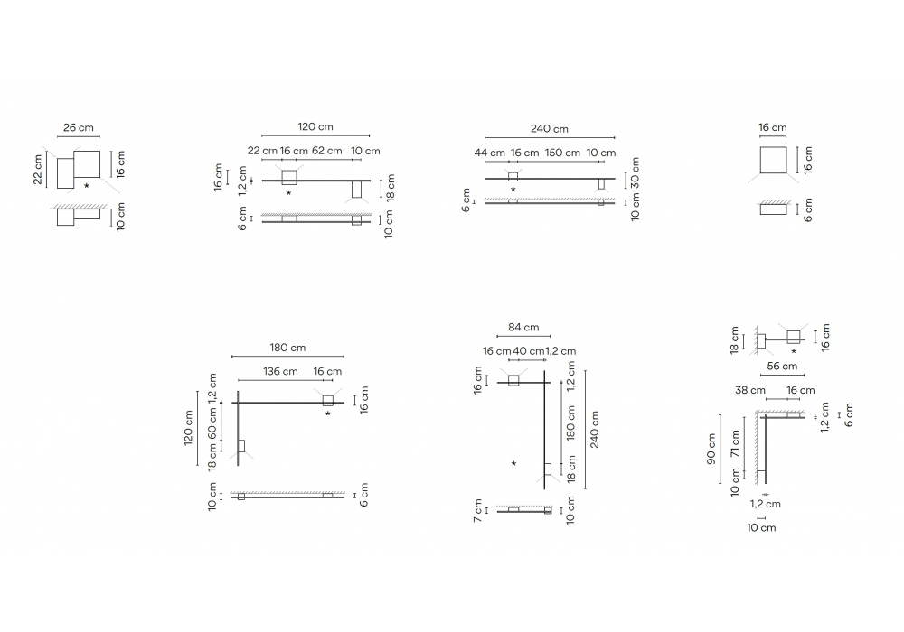 | Abmessungen | 26 x 22 x H 10 cm; 120 x 16 x H 10 cm; 240 x 16 x H 30 cm; 16 x 16 x H 6 cm; 180 x 16 x H 6 cm; 84 x 16 x H 240 cm; 56 x 10 x H 90 cm. |