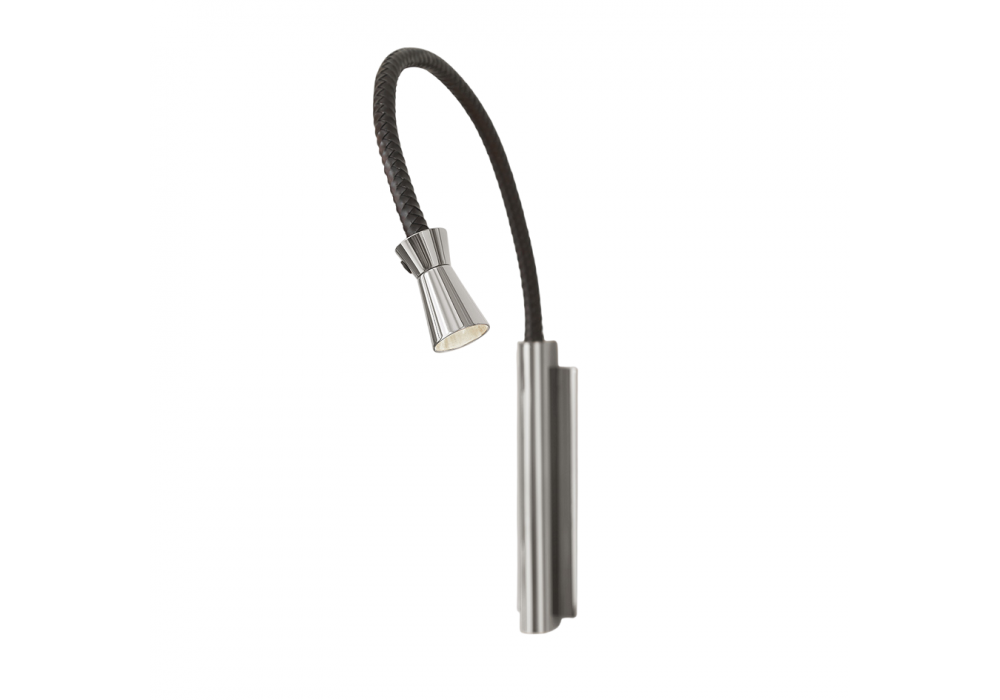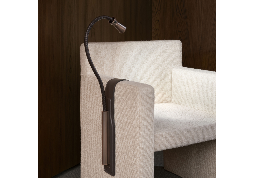 G+T Nomad von Jan Van Lierde für Contardi entworfen, ist eine Leuchte mit Metallfuß und -diffusor sowie einem dunkelbraunen, gewebten Lederrahmen. Der Leuchtenkopf ist mit einem dreistufigen Dimmer (100 %, 70 % und 30 %) ausgestattet. Verschiedenes Zubehör für die Wand-, Tisch- oder Sofamontage ist erhältlich. Es bietet eine Akkulaufzeit von bis zu 10 Stunden. Der Akku ist in 6–8 Stunden über das mitgelieferte USB-C-Kabel aufgeladen. Netzteil nicht im Lieferumfang enthalten.