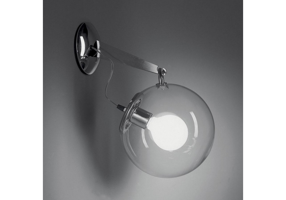 Miconos von Ernesto Gismondi für Artemide entworfen ist eine Wandleuchte mit tragender Struktur aus lackiertem Stahl. Der Diffusor ist kugelförmig, besteht aus transparentem mundgeblasenem Glas und verfügt über eine dimmbare LED-Lichtquelle. Miconos ist in verschiedenen Ausführungen erhältlich.