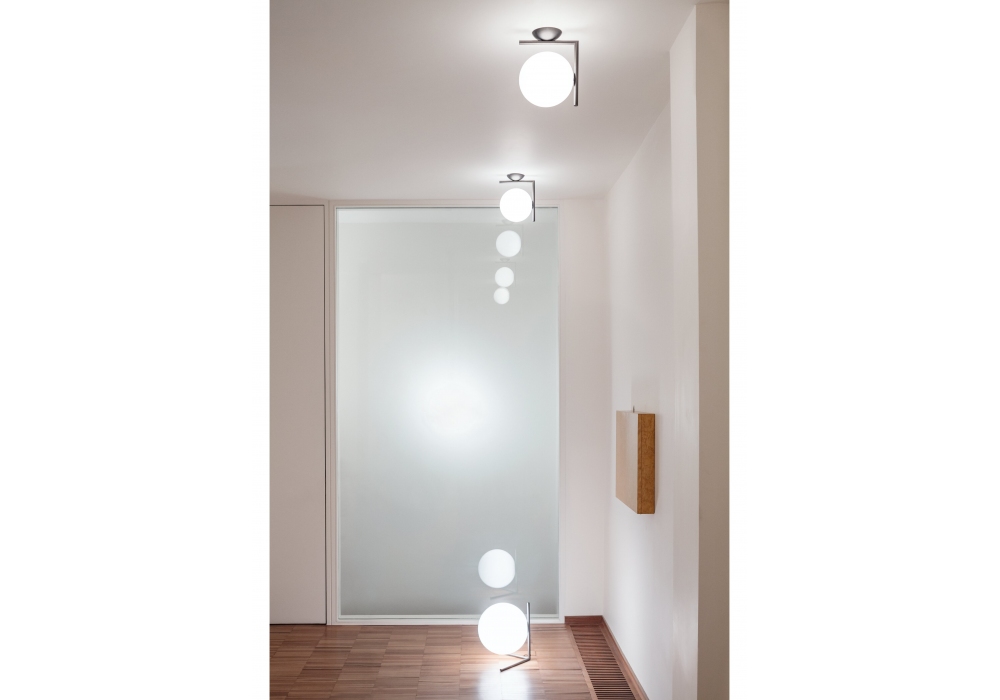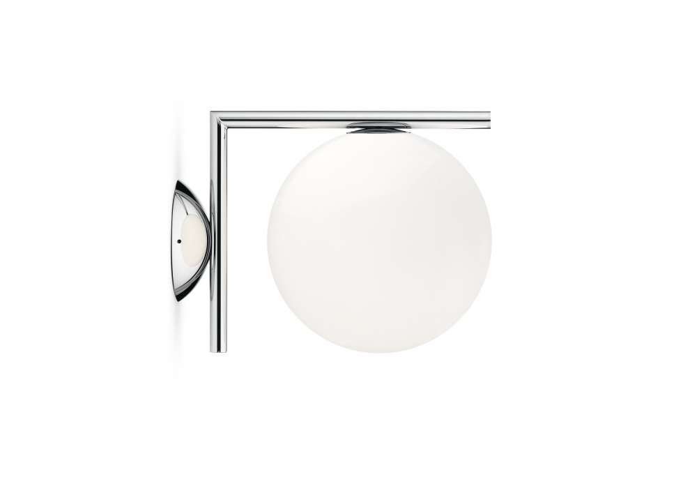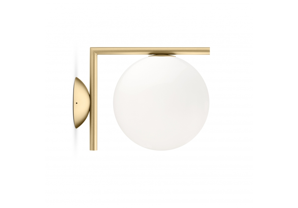 IC C/W1 von Michael Anastassiades für Flos entworfen, ist eine Wand-/Deckenleuchte mit diffusem Licht. Gestell aus Messing, gebürstetem und transparent lackiertem oder verchromtem Stahl. Opaler Diffusor aus geblasenem Glas. Fernverstellbar (Dimmer nicht enthalten). Leuchtmittel nicht enthalten.