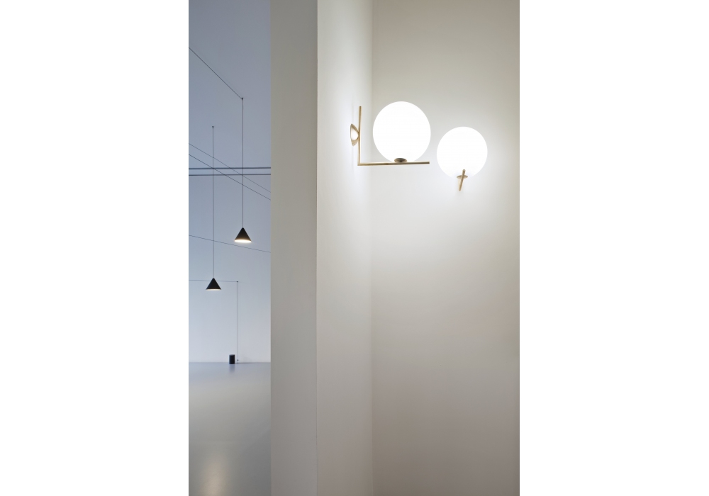 IC C/W2 von Michael Anastassiades für Flos entworfen, ist eine Wand-/Deckenleuchte mit diffusem Licht. Gestell aus Messing, gebürstetem und transparent lackiertem oder verchromtem Stahl. Opaler Diffusor aus geblasenem Glas. Fernverstellbar (Dimmer nicht enthalten). Leuchtmittel nicht enthalten.
