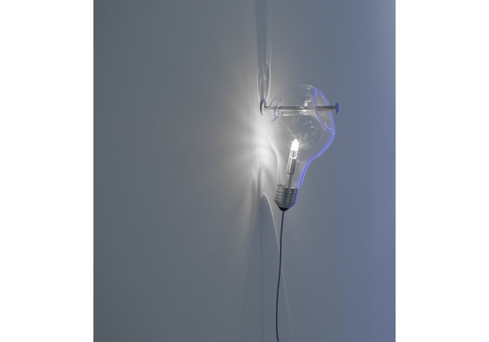 Edison's Nightmare von Harry Thaler für Davide Groppi entworfen, ist eine Wandleuchte mit Struktur aus Glas und Metall. Der Diffusor besteht aus abgerundetem Glas und schirmt eine dimmbare Halogenlichtquelle ab.