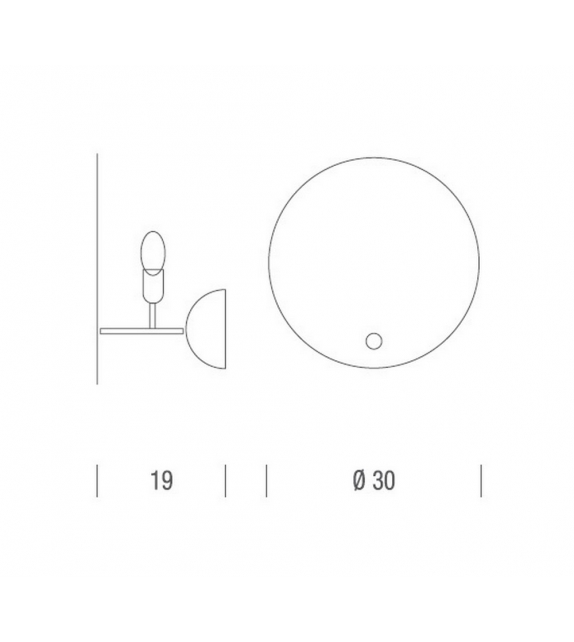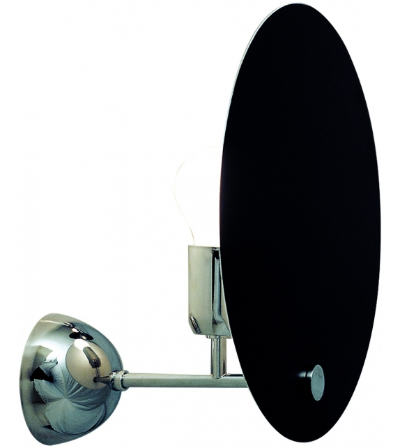 Kuta von Vico Magistrettidi für Nemo entworfen, ist eine Wandleuchte mit tragender Struktur aus verchromtem Metallrohr. Der Reflektor ist kreisförmig und schirmt eine dimmbare LED-, Halogen- oder Fluo-Lichtquelle ab.