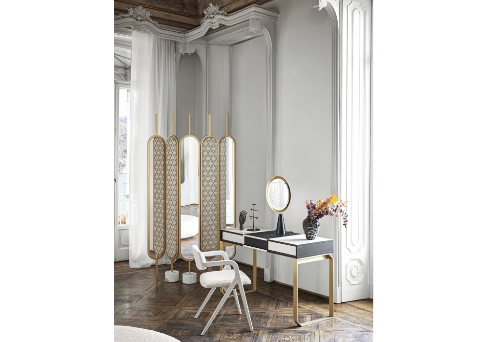 Chloé von Gallotti&Radice ist eine Wandschirm mit Gestell aus Holz und Metall Messing satiniert lackiert. Seiten mit Extralight Spiegel und Stoff “Ribon Opaline” von Lelièvre Signature umkleidet. Fussteile aus Marmor Natur poliert Calacatta Vagli Oro.