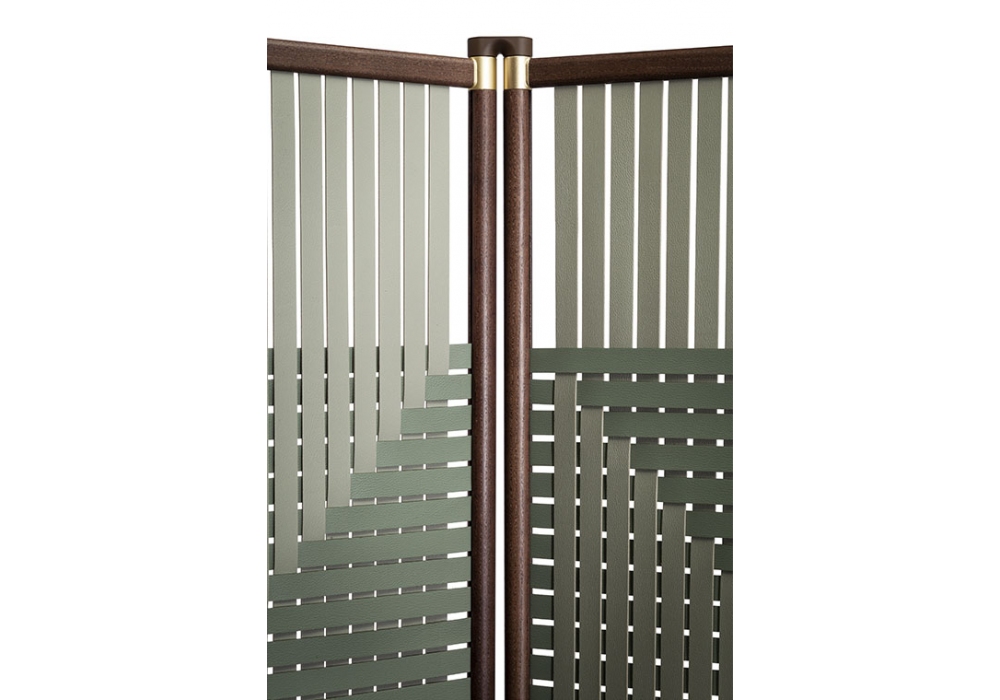 Plot von GamFratesi für Poltrona Frau entworfen, ist ein Raumteiler mit Aluminiumrohr, das mit einem Moka-Finish furniert ist und mit Metallverbindungen mit einem matten Messing-Finish verbunden ist. Im unteren Bereich wird die Struktur von Metallfüßen mit mattem Messingfinish getragen, die an konisch lackierten konischen Metallkappen befestigt sind. Die Lederbänder sind an den Metallrohren eingehakt und so gewebt, dass ein kreisförmiges oder quadratisches Design entsteht.