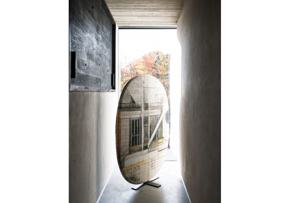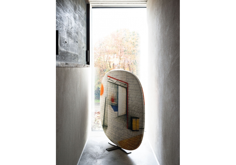 Nebula Interiors von Pearson Lloyd für Tacchini entworfen, ist eine Trennwand bestehend aus zwei miteinander verklebten MDF-Platten. Bezogen mit weicher Polsterung und bezogen mit Stoffen von Lucia Pescador. Es ist als Hänge- oder Bodenversion erhältlich.
