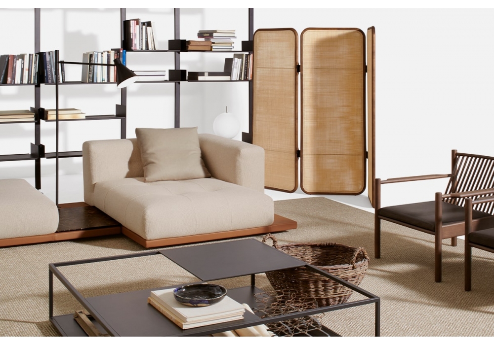 Ava, von David Lopez Quincoces für DePadova entworfen, ist ein Raumteiler aus nussbaumfarben gebeiztem Massivholz mit strohgetäfelter, weißer Schilfrinde. Erhältlich in der Version mit 3 Türen und 5 Türen.