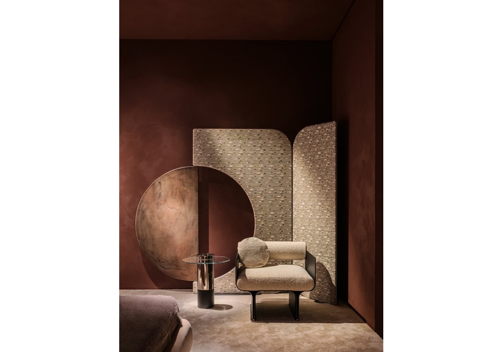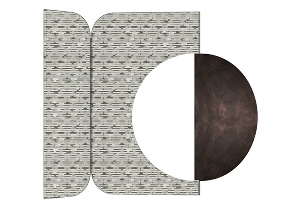 Enso von Studio G&R für Gallotti&Radice entworfen, ist ein Wandschirm bestehend aus zwei Holzpaneelen, bezogen mit dem Stoff Utopia Silber 101 oder Sagi Silber 022, und einem beweglichen, halbmondförmigen Holzpaneel mit „Brünierungseffekt“. Die Metallfüße sind in der Farbe „Gunmetal“ lackiert. Der Bezug ist nicht abnehmbar.