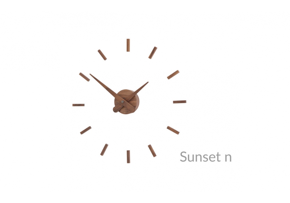 Sunset, entworfen und hergestellt von Nomon, ist eine Wanduhr mit 12 Zeitsignalen aus Nussbaumholz, zentralem Gehäuse aus verchromtem oder poliertem Messing oder aus Nussbaum.
