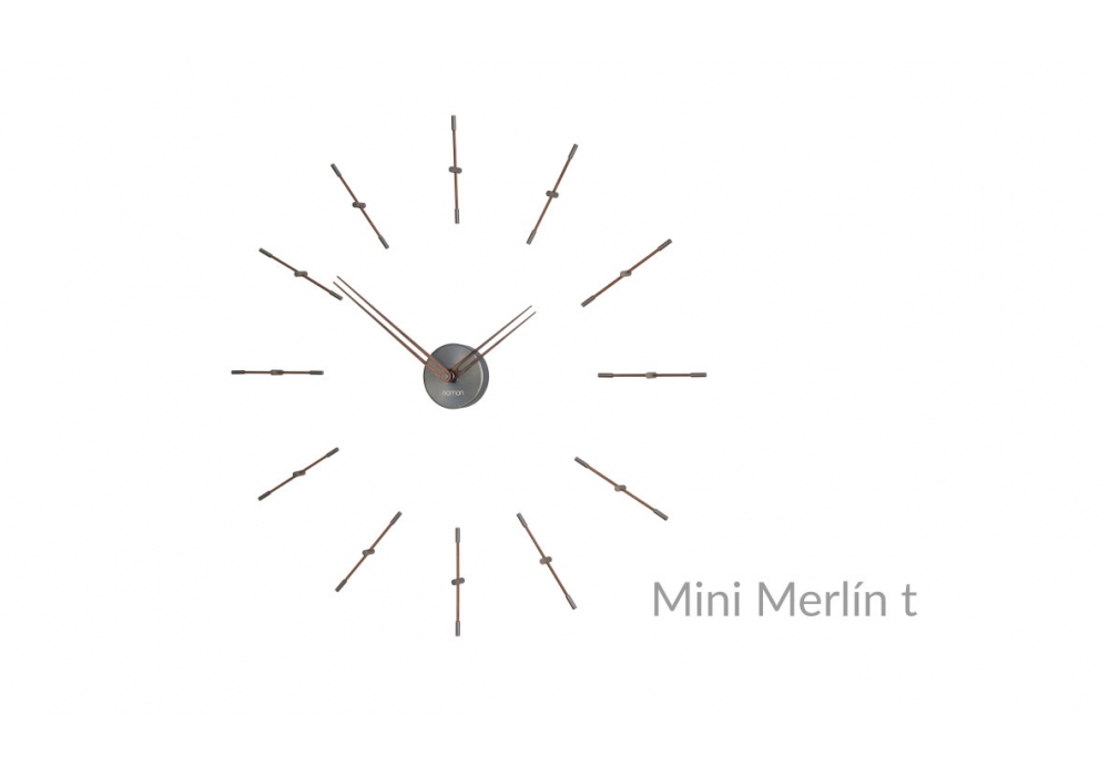 Mini Merlìn, entworfen und hergestellt von Nomon, ist eine Wanduhr mit 4 oder 12 Zeitsignalen aus verchromtem oder poliertem Messing, Zeigern aus Walnussholz.
