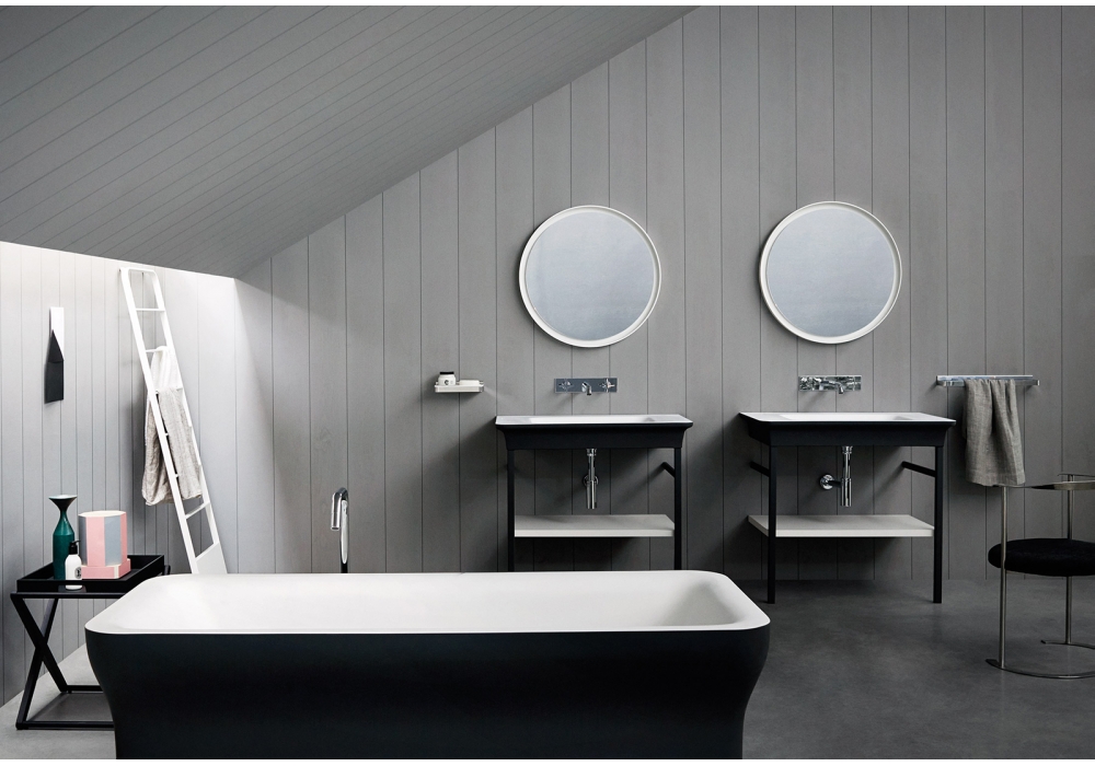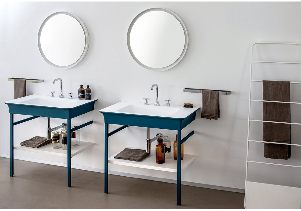 Novecento XL von Benedini Associati für Agape entworfen, ist ein Waschbecken aus Ceramilux® oder Marmor in verschiedenen Ausführungen. Frei fließend, inklusive Befestigungsset. Auch erhältlich mit einer Struktur aus poliertem oder gebürstetem brüniertem Edelstahl oder mattweiß (RAL9003), dunkelgrau (RAL7021) oder hellgrau (RAL7044), komplett mit seitlichen Handtuchhaltern und einem weiß lackierten Holzregal. Verfügbar in verschiedenen Ausführungen. Mit Ablauf.