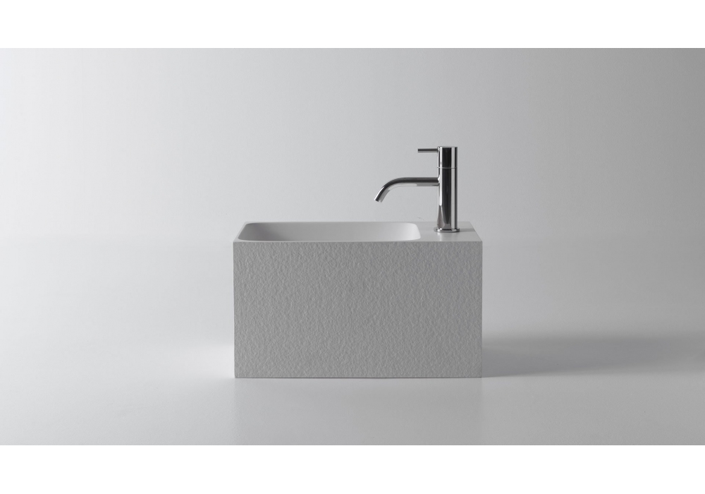 Calco von Nevio Tellatin für Antonio Lupi entworfen, ist ein rechteckiges Wandwaschbecken in strukturierter Flumood-Ausführung, komplett mit Abfluss mit offenem Ablauf und Siphonanschluss.