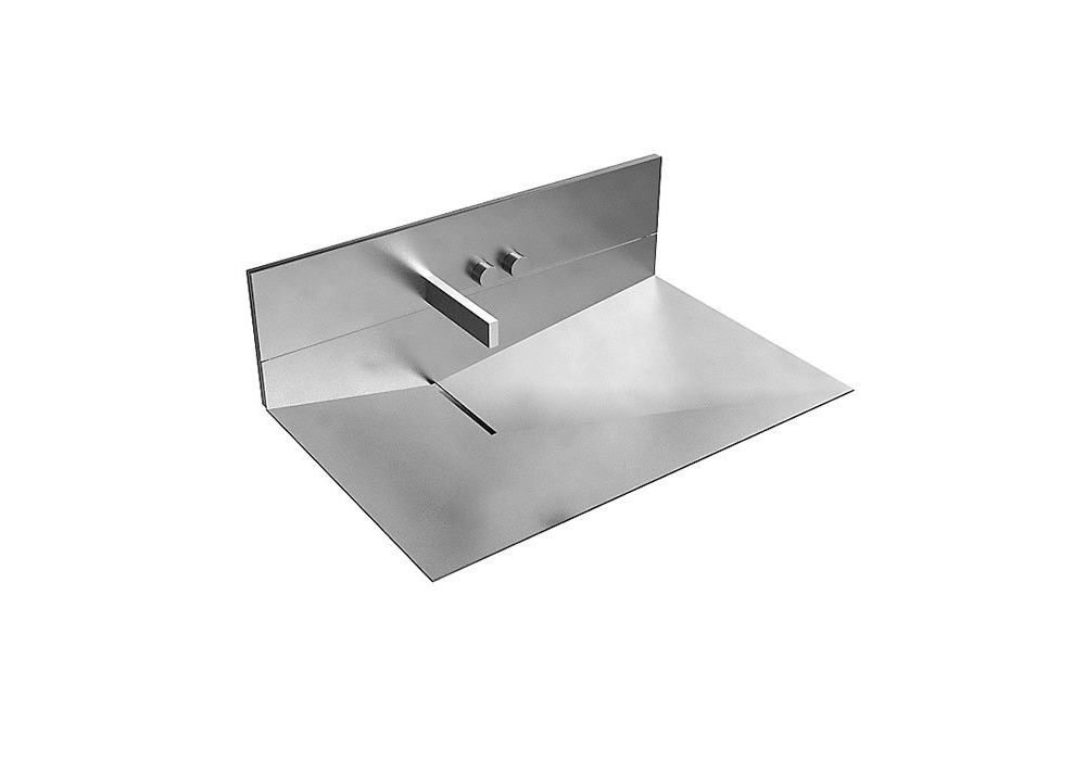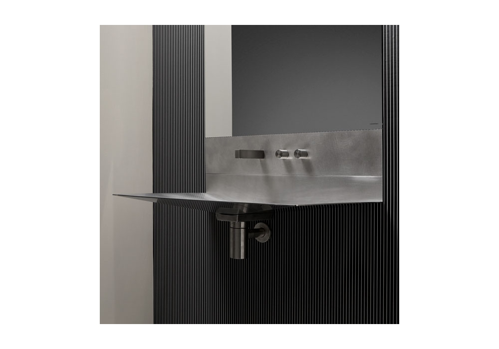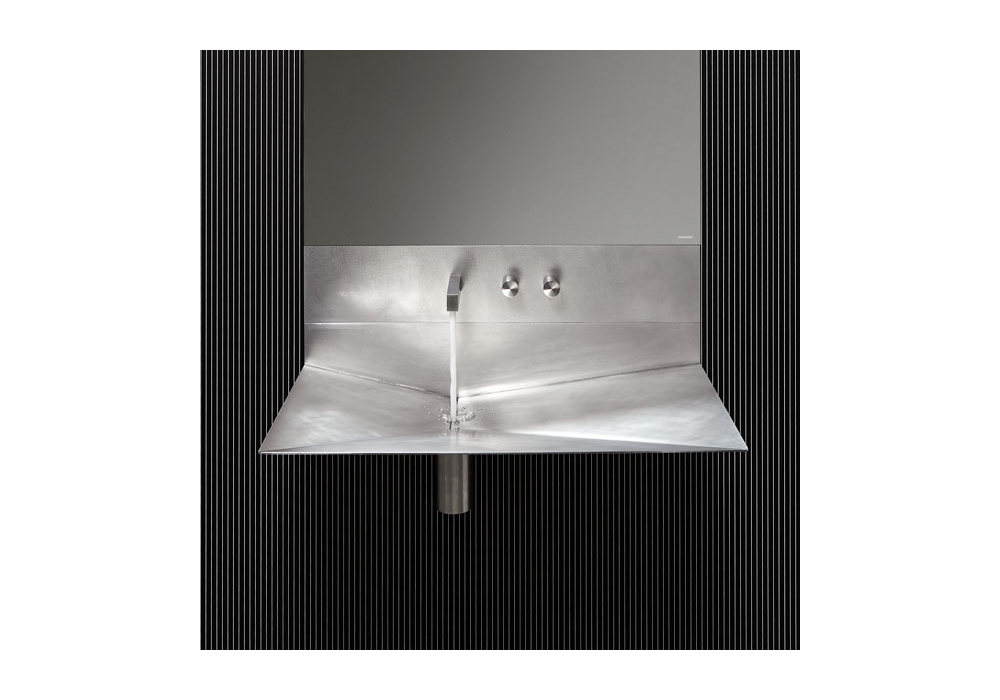 Lavandino von Francesca Braga Rosa und Ivano Vianello für Antonio Lupi entworfen, ist ein rechteckiges, wandmontiertes Waschbecken aus Edelstahl, komplett mit Wasserhähnen, offenem Abfluss und Siphonanschluss.