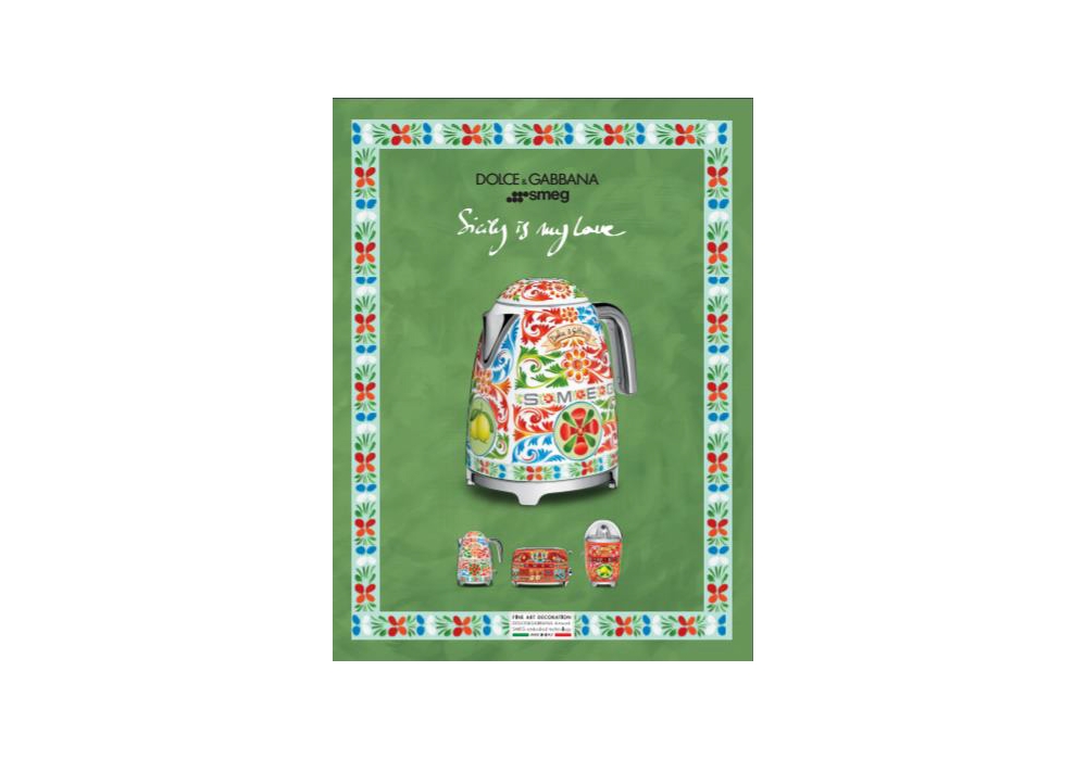 Sicily is my love Wasserkocher, von Dolce&Gabbana für Smeg entworfen, ist realisiert mit lackiertem Edelstahl Körper und Chromteilen. Der Wasserkocher ist mit dem Motiv des sizilianischen Wagens und mit verschiedenen gricori verziert.