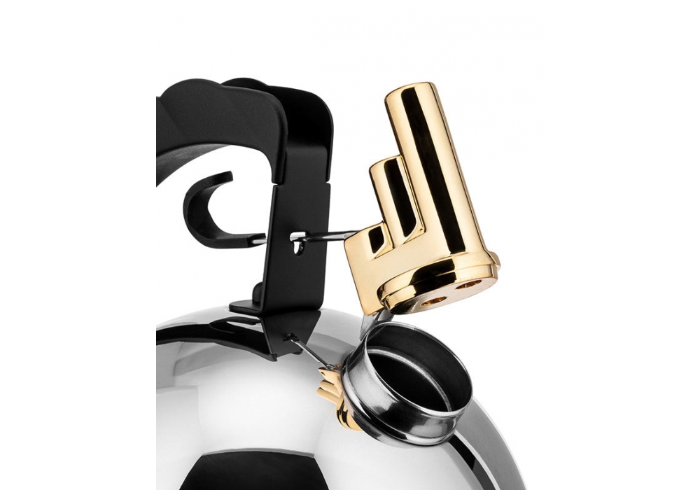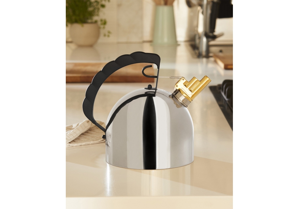 9091, von Richard Sapper für Alessi entworfen, ist ein Wasserkessel aus Edelstahl 18/10 mit Griff aus schwarzem PA und melodischer Pfeife aus Messing. Magnetischer Stahlboden geeignet für Induktionskochen.
